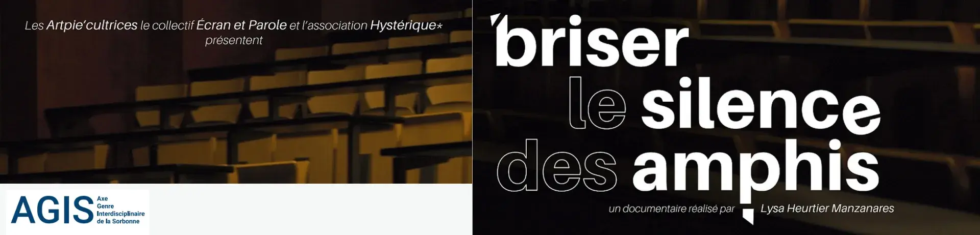 Les violences sexuelles et sexistes dans l’Enseignement supérieur et la Recherche sont une réalité maintenant bien documentée aux conséquences souvent dramatiques, mais dont les établissements français n’ont pas encore pris la pleine mesure. Issue d’une collaboration entre plusieurs associations et collectifs – l’association Écran et Parole, association formée par 4 enseignantes-chercheuses ; l’association étudiante féministe Queer intersectionnelle Hystérique* de l’université Sorbonne Nouvelle ; l’association Les Artpie’cultrices – le documentaire Briser le silence des amphis est un projet à la fois militant et pédagogique, qui veut apporter sa contribution à la lutte contre les violences sexistes et sexuelles dans l’Enseignement supérieur et la Recherche, et servir d’outil à toutes celles et ceux qui la mènent.